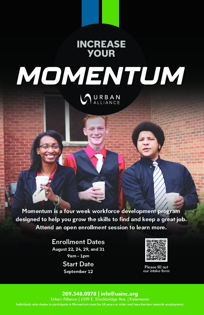 Momentum is a four week workforce development program designed to help participants grow the skills to find and keep a great job. Attend an open enrollment session to learn more!